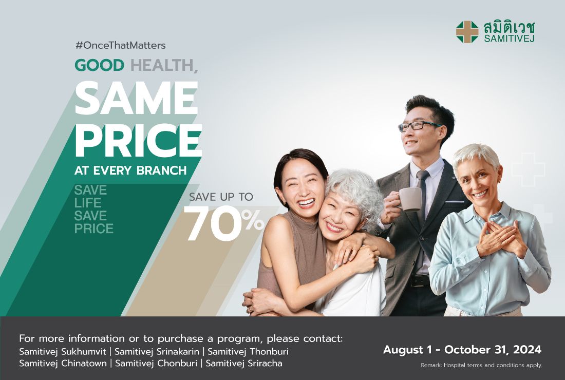 Chairat Panthuraamphorn, M.D., CEO of Samitivej and BNH Hospitals, stated that people are currently facing many challenges in their lives, including stress, the economy, inflation and a rising cost of living, all of which can negatively impact health. As part of its commitment to keep people healthy, Samitivej is launching a major new campaign: Save Life Save Price. Offering good health at uniform pricing for select health services across the Samitivej Group, the campaign is starting with health check-ups starting at just 2,700 THB.