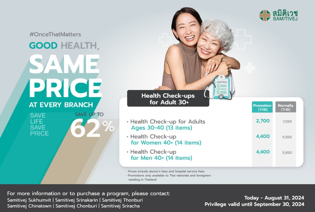 These programs can be purchased from now until August 31, 2024, and the services are redeemable through September 30, 2024. Prices include doctor’s fees and hospital service fees and are available for both Thai nationals and foreigners residing in Thailand.