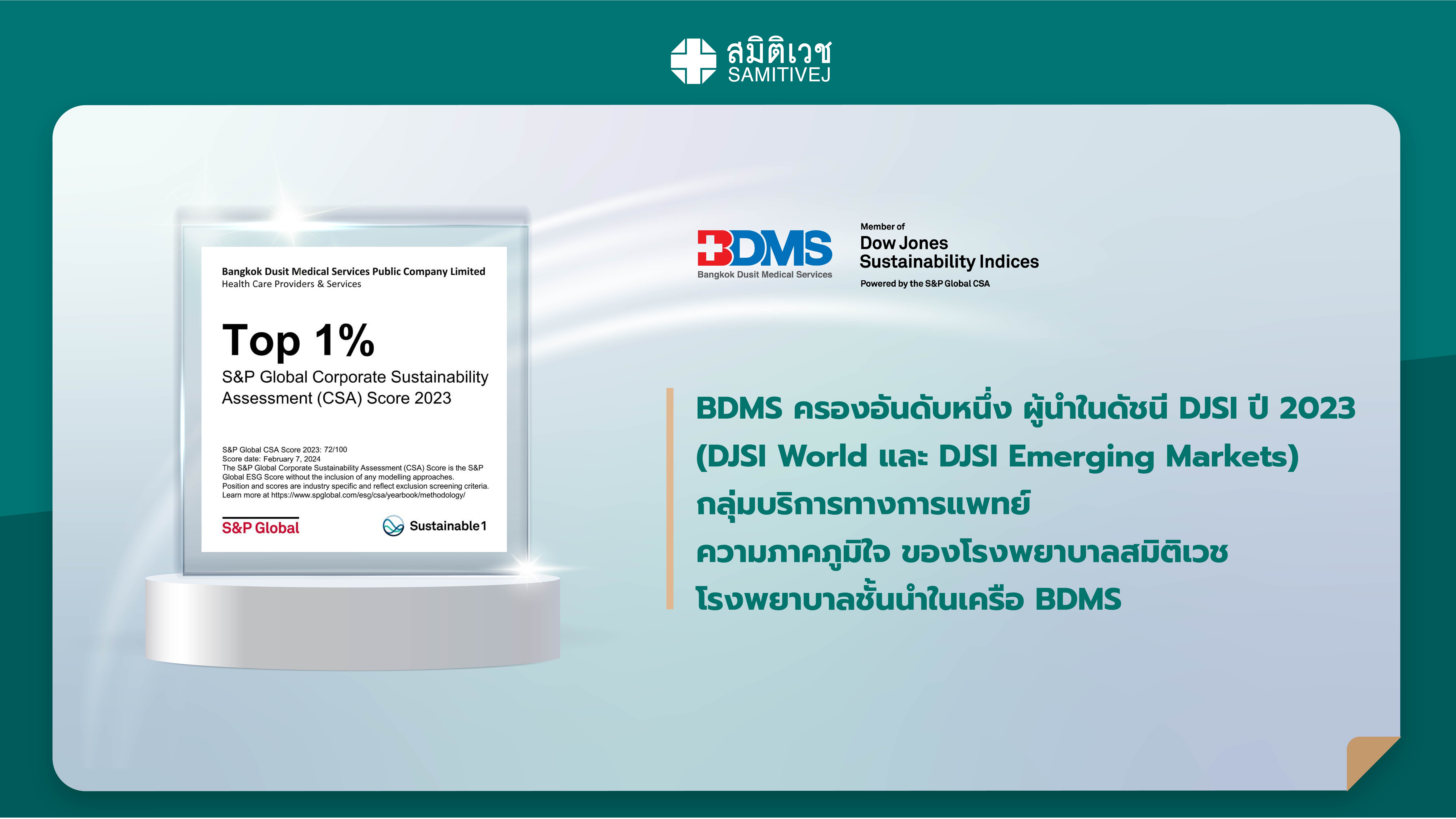 BDMS มุ่งสู่ Medical Sustainability หลังครองอันดับหนึ่ง ผู้นำในดัชนี DJSI ปี 2023 กลุ่มบริการทางการแพทย์ (Health Care Providers & Services) ทั้งในระดับโลก (DJSI World) เป็นปีแรก และกลุ่มตลาดเกิดใหม่ (DJSI Emerging Markets) ต่อเนื่องเป็นปีที่ 3 ด้วยคะแนนอันดับ 1 มิติด้านสังคม จากการประเมินของ S&P Global.