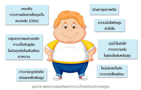 ข้อมูลสถิติข้างต้นเป็นสัญญาณเตือนและบ่งชี้ให้เราทราบว่า ภาวะอ้วนไม่ได้คุกคามแค่ผู้ใหญ่ แต่กำลังคืบคลานเพิ่มขึ้นในเด็ก และก็มีผลกระทบจากภาวะแทรกซ้อนตัดออกนี้ต่อเด็กด้วยเช่นกัน ที่น่าเป็นกังวลก็คือภาวะแทรกซ้อนต่างๆเหล่านี้ก็เริ่มพบมากขึ้นตั่งแต่ลูกอายุยังน้อยอีกด้วย และลูกก็ยังมีอายุอีกยาวนานที่จะอยู่กับภาวะแทรกซ้อนเหล่านั้น ปัจจุบันเราเริ่มได้รับข้อมูลการศึกษาเกี่ยวกับภาวะแทรกซ้อนอันเกิดจากภาวะน้ำหนักเกินอันผิดปกตินี้กันมากขึ้น ผู้เชี่ยวชาญหลายท่านก็ให้ข้อมูลเกี่ยวกับอันตรายจากภาวะอ้วนในระบบต่างๆ (Daniels SR 2009) เช่น กลุ่มอาการเมตาบอลิก ภาวะดื้ออินซูลิน ไขมันอุดตันในเส้นเลือด ความเสี่ยงต่อเบาหวานที่เพิ่มมากขึ้น ภาวะทางเดินหายใจอุดกั้นขณะหลับหรือรุนแรงกว่านั้น และ ภาวะกระดูกข้อต่ออักเสบหรือผิดรูป เป็นต้น