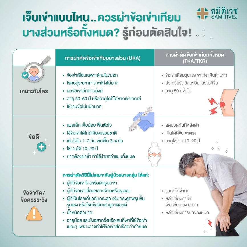 - ตารางเปรียบเทียบการผ่าตัดเปลี่ยนข้อเข่าเทียมแบบบางส่วน (UKA) กับทั้งหมด (TKA)