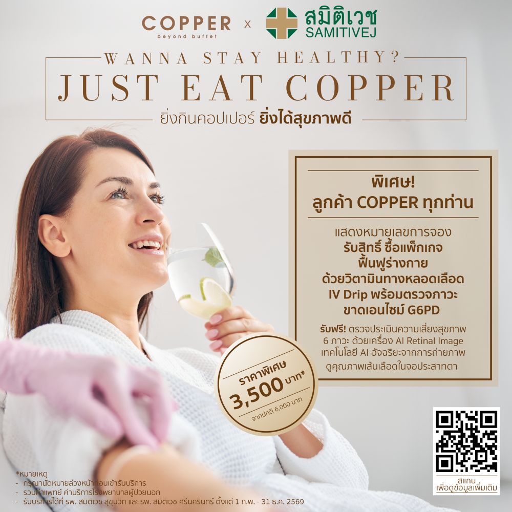 สำหรับท่านที่มารับประทานอาหารที่ Copper ทุกแพ็กเกจ ทั้ง 2 สาขา ได้แก่ สาขาเดอะเซ้นส์ ปิ่นเกล้า และ สาขาเกษร อัมรินทร์ เพียงแสดงหมายเลขการจองของ Copper รับสิทธิพิเศษซื้อแพ็กเกจ ฟื้นฟูร่างกายด้วยวิตามินทางหลอดเลือด IV Drip พร้อมตรวจภาวะขาดเอนไซม์ G6PD เพื่อประเมินความพร้อมของเม็ดเลือดแดงและความเหมาะสมของร่างกายก่อนรับวิตามิน มูลค่า 3,500 บาท จากราคาเต็ม 6,000 บาท พร้อม รับฟรี ตรวจประเมินความเสี่ยงสุขภาพ 6 ภาวะ ด้วยเครื่อง AI Retinal Image เทคโนโลยี AI อัจฉริยะจากการถ่ายภาพดูคุณภาพเส้นเลือดในจอประสาทตา