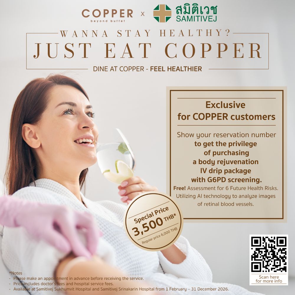 - 所有 Copper Buffet 套餐预订代码均可享受购买维生素 IV 滴注恢复套餐(1 次疗程),包括红细胞 G6PD(葡萄糖-6-磷酸脱氢酶)缺乏症筛查,特价 3,500 泰铢(原价 6,000 泰铢)。